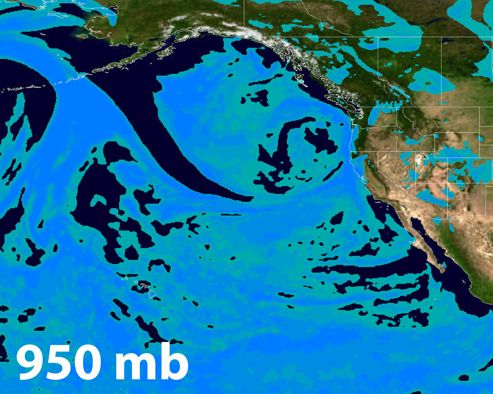 If we examine the Relative Humidity of the atmosphere at various levels above the surface, we can see that the AR moisture source appears to have been streaming in first from the Northern Pacific, plunging south around the base of the trough off the Pacific NW Coast of the US, and then coming up from the WSW straight into Central California.