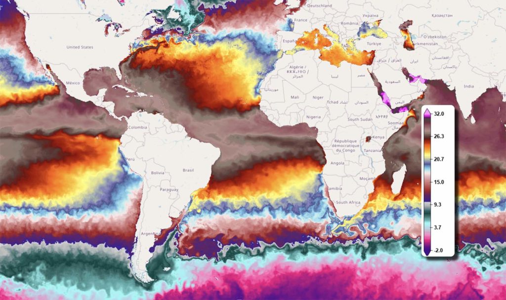 This chart, created with Spire Global’s data, illustrates sea surface temperature in degrees celsius.