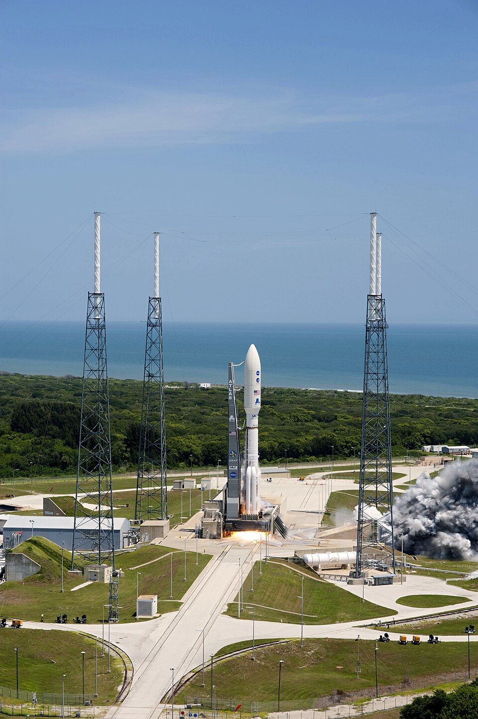 English: CAPE CANAVERAL, Fla. -- Backdropped by the Atlantic Ocean and surrounded by its four-tower lightning protection system, NASA's Juno planetary probe, enclosed in its payload fairing, is seconds away from liftoff atop a United Launch Alliance Atlas V rocket. Leaving from Space Launch Complex 41 on Cape Canaveral Air Force Station in Florida, the spacecraft will embark on a five-year journey to Jupiter. Liftoff was at 12:25 p.m. EDT Aug. 5. The solar-powered spacecraft will orbit Jupiter's poles 33 times to find out more about the gas giant's origins, structure, atmosphere and magnetosphere and investigate the existence of a solid planetary core. For more information, visit www.nasa.gov/juno. |