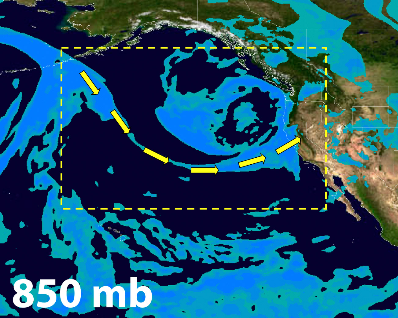 A still image of the 850mb layer of Relative Humidity showcases the shape and origination of the Atmospheric River the best, but the animation allows us to see that the increased water vapor has true depth to it, extending well up into the middle troposphere to 500mb.