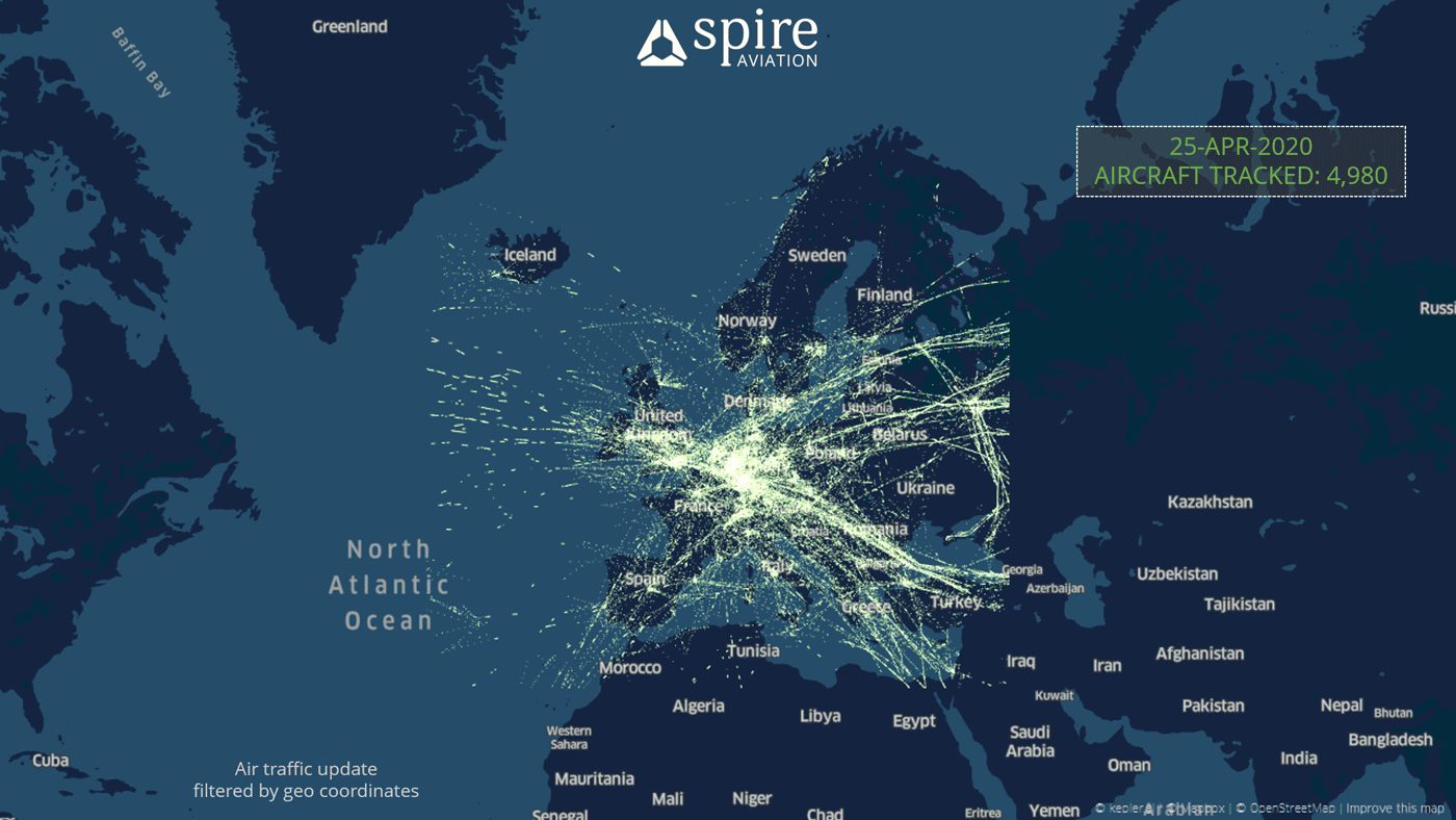 With the pandemic causing such a decline in traffic around the world, you may have wondered, “How has this drop in traffic affected CO2 emissions?” We’ve put together an aviation-focused analysis that might help put this drop in more real-world terms. To get this estimate, we used Spire Aviation air traffic data and general statistics(1) on average aircraft and passenger car emissions.